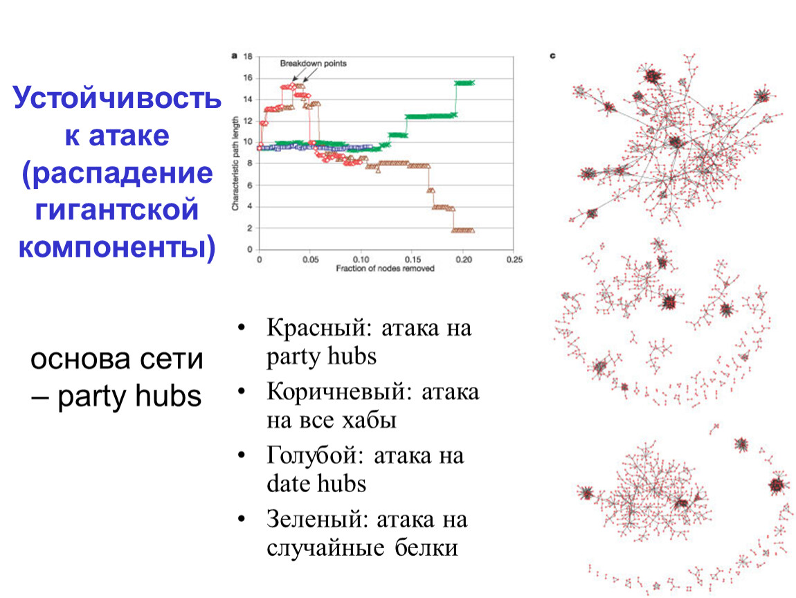 Устойчивость к атаке (распадение гигантской компоненты)основа сети – party hubs