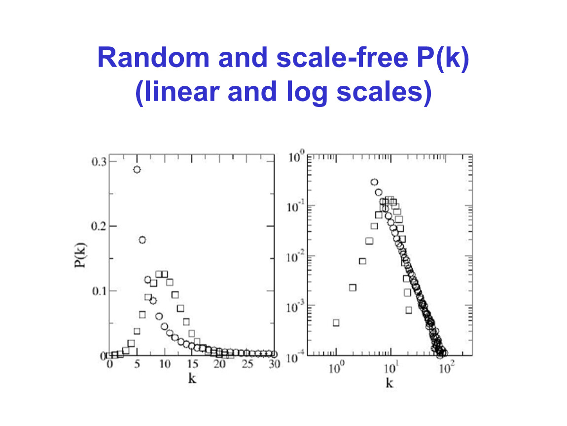 распределение степеней вершин P(k) = вероятность того, что у случайно взятой вершины будет k ребер