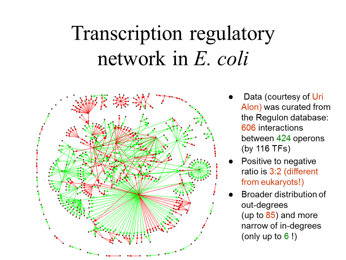 Data (courtesy of Uri Alon) was curated from the Regulon database: 606 interactions between 424 operons (by 116 TFs)