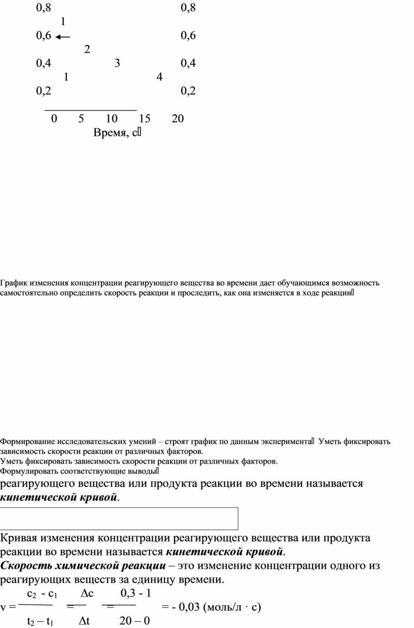 График изменения концентрации реагирующего вещества во времени дает обучающимся возможность самостоятельно определить скорость реакции и проследить, как она изменяется в ходе реакции |