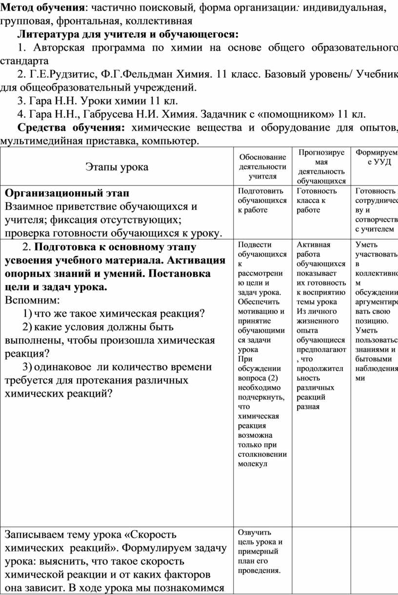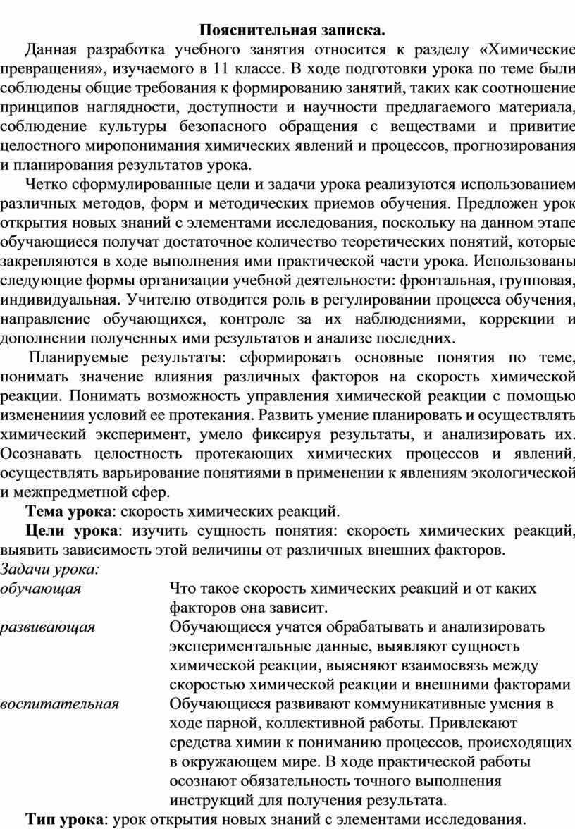 Данная разработка учебного занятия относится к разделу «Химические превращения», изучаемого в 11 классе. В ходе подготовки урока по теме были соблюдены общие требования к формированию занятий, таких как соотношение принципов наглядности, доступности и научности предлагаемого материала, соблюдение культуры безопасного обращения с веществами и привитие целостного миропонимания химических явлений и процессов, прогнозирования и планирования результатов урока.