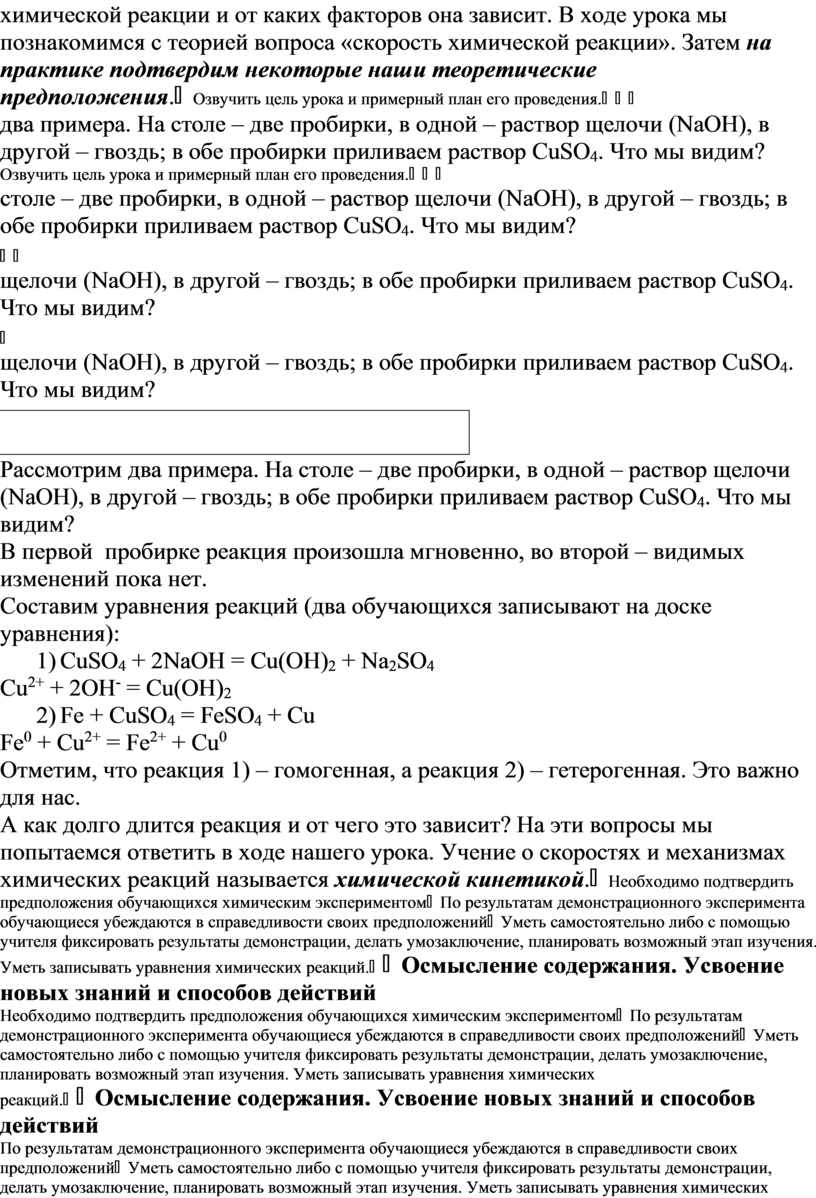 Рассмотрим два примера. На столе – две пробирки, в одной – раствор щелочи (NaOH), в другой – гвоздь; в обе пробирки приливаем раствор CuSO4. Что мы видим? В первой пробирке реакция произошла мгновенно, во второй – видимых изменений пока нет. Составим уравнения реакций (два обучающихся записывают на доске уравнения): 1) CuSO4 + 2NaOH = Cu(OH)2 + Na2SO4 Cu2+ + 2OH- = Cu(OH)2 2) Fe + CuSO4 = FeSO4 + Cu Fe0 + Cu2+ = Fe2+ + Cu0 Отметим, что реакция 1) – гомогенная, а реакция 2) – гетерогенная. Это важно для нас. А как долго длится реакция и от чего это зависит? На эти вопросы мы попытаемся ответить в ходе нашего урока. Учение о скоростях и механизмах химических реакций называется химической кинетикой. |