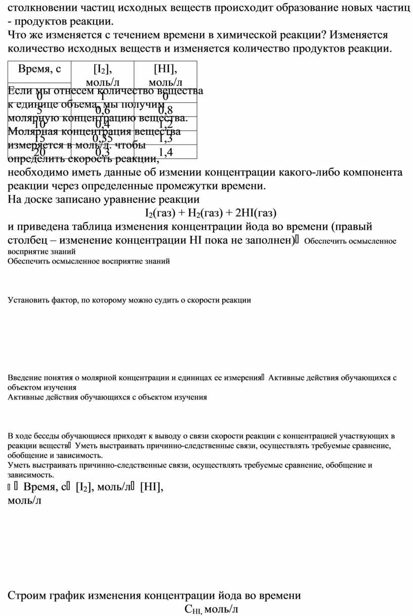 3. Осмысление содержания. Усвоение новых знаний и способов действий Обратимся к понятию «скорость». Вам известны такие сочетания, как скорость движения, скорость чтения, скорость наполнения бассейна и т. д. В общем случае, что такое скорость? Изменение какого-либо фактора за единицу времени. А какой же фактор изменяется, когда речь идет о скорости реакции? Мы уже сказали, что химическая реакция происходит при столкновении частиц. Тогда, очевидно, что скорость реакции тем больше, чем чаще сталкиваются частицы. При столкновении частиц исходных веществ происходит образование новых частиц - продуктов реакции. Что же изменяется с течением времени в химической реакции? Изменяется количество исходных веществ и изменяется количество продуктов реакции. Если мы отнесем количество вещества к единице объема, мы получим молярную концентрацию вещества. Молярная концентрация вещества измеряется в моль/л. чтобы определить скорость реакции, необходимо иметь данные об измении концентрации какого-либо компонента реакции через определенные промежутки времени. На доске записано уравнение реакции I2(газ) + H2(газ) + 2HI(газ) и приведена таблица изменения концентрации йода во времени (правый столбец – изменение концентрации HI пока не заполнен) |