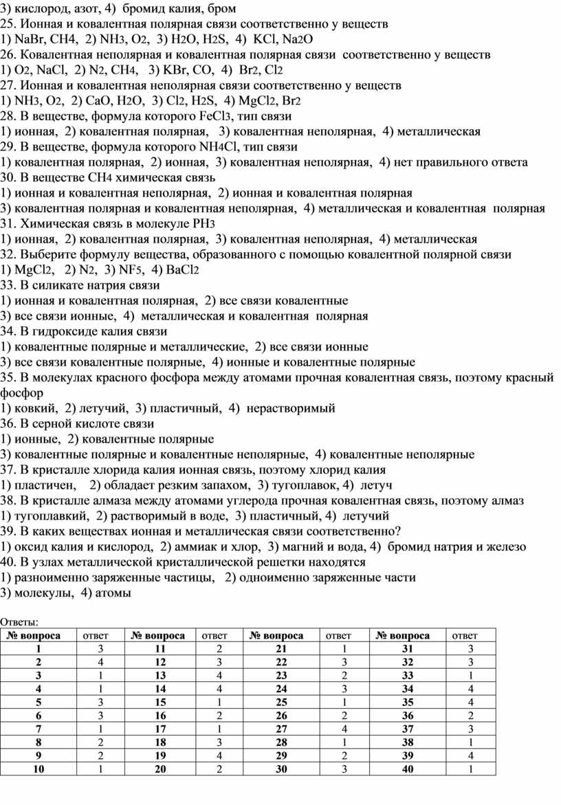 1) ковалентная неполярная, 2) ионная, 3) металлическая, 4) ковалентная полярная