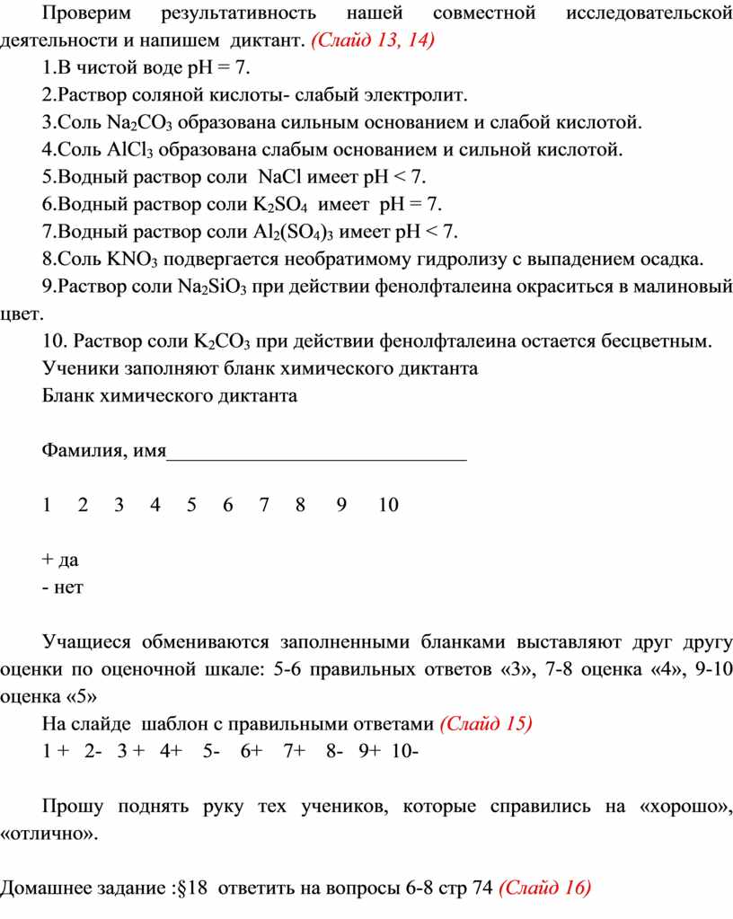 Итак, сегодня мы познакомились с явлением гидролиза солей. Прошу дать краткие ответы на мои вопросы.