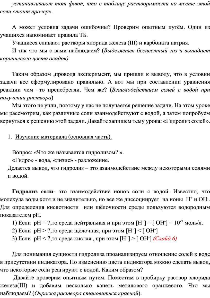 Оборудование: учебник Рудзитис Г.Е Фельдман Ф. Г., таблица растворимости, индикаторная шкала, штатив с пробирками; растворы фенолфталеина, метилового оранжевого, соляной кислоты, гидроксида натрия, хлорида железа(3), карбоната натрия, хлорида натрия.