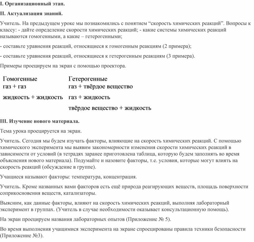 Учитель. На предыдущем уроке мы познакомились с понятием “скорость химических реакций”. Вопросы к классу: - дайте определение скорости химических реакций; - какие системы химических реакций называются гомогенными, а какие – гетерогенными;