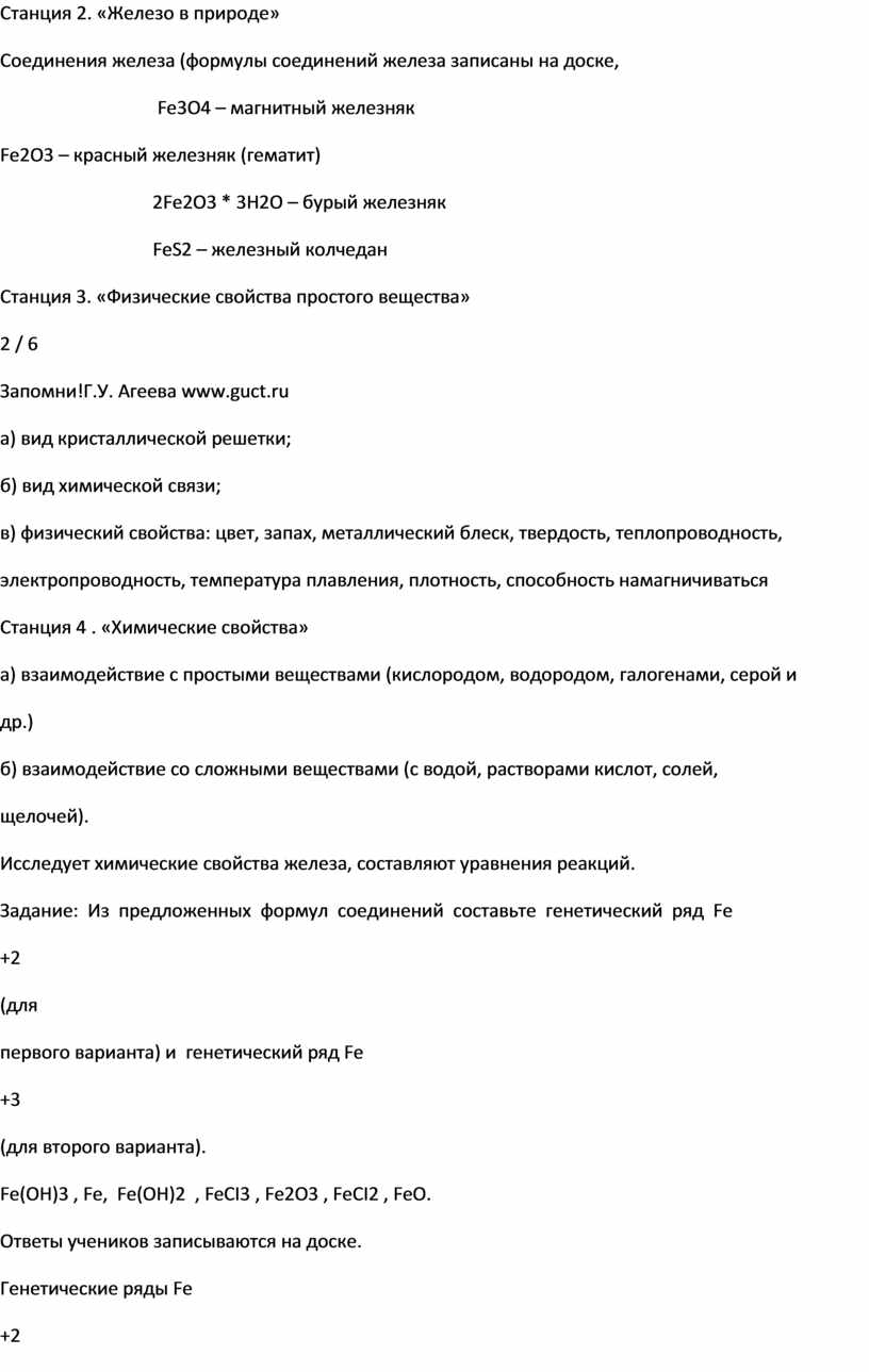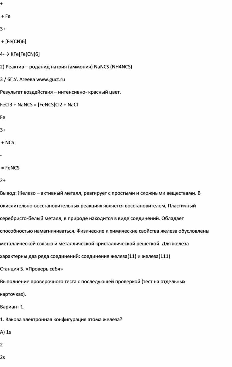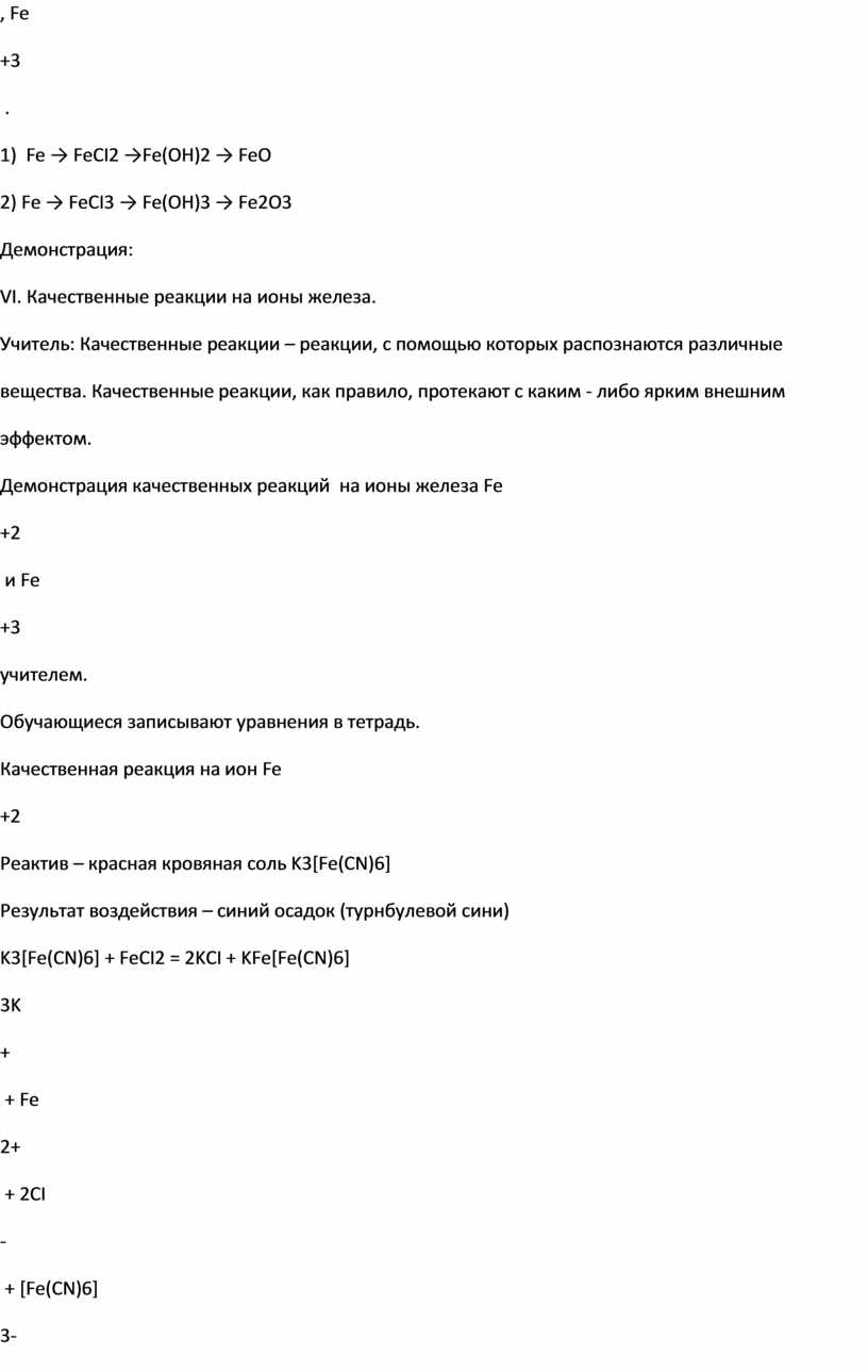 Н а с т о л а х у ч а щ и х с я: коллекция «Железо», раздаточный материал: карточки «Физические свойства железа», инструктивные карточки к лабораторной работе «Качественные реакции на ионы железа», карточки для закрепления учебного материала; растворы FeSO4 и FeCl3, гексацианоферрата(III) калия K3[Fe(CN)6] (красная кровяная соль), гексацианоферрата(II) калия K4[Fe(CN)6] (желтая кровяная соль), KSCN, NaOH, HCl, CuSO4, Fe (две пробирки), железная скрепка на нитке, Н2О.