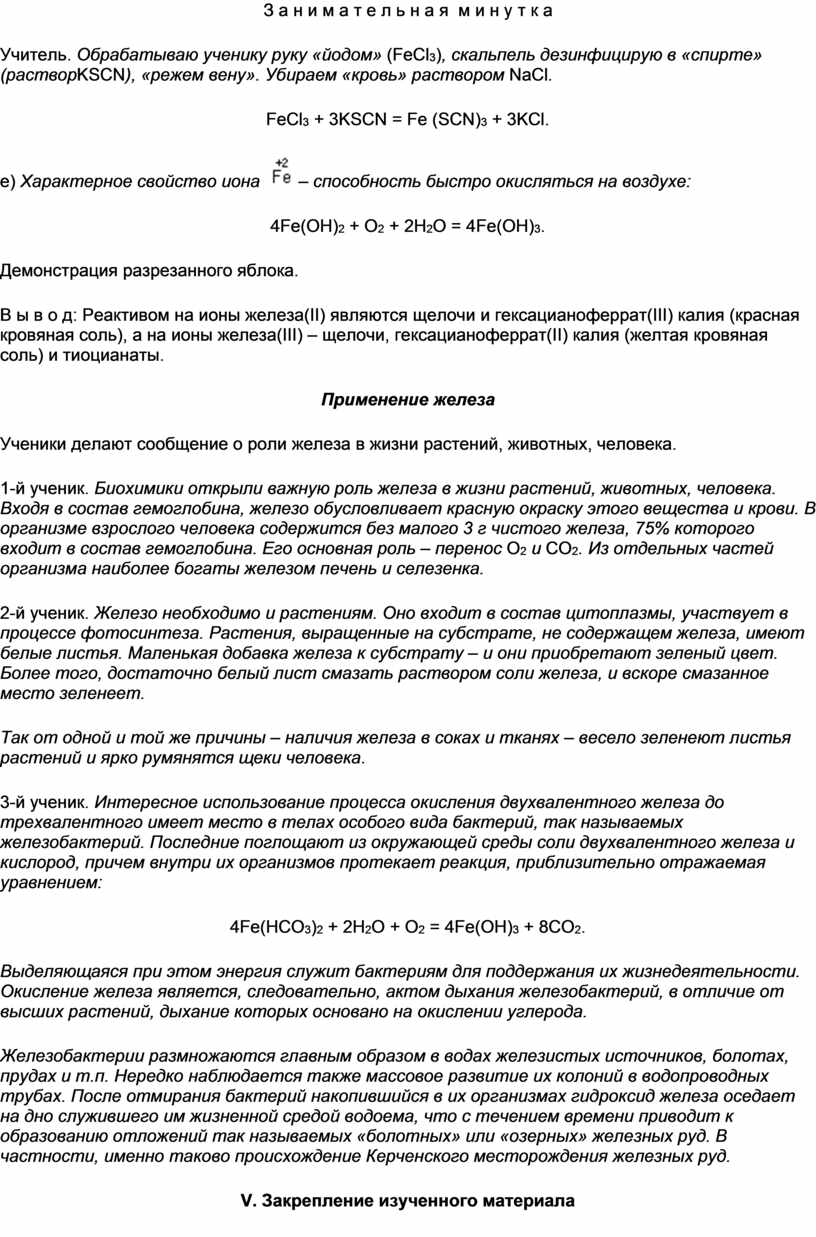 Н а д е м о н с т р а ц и о н н о м с т о л е: лабораторный штатив, стеклянная трубка в лапке (диаметр 1 см), спиртовка, спички, воронка, скальпель, стеклянная палочка, вата; Fe (порошкообразный), S, магнит, листок бумаги, растворы FeCl3, KSCN, NaCl, гвозди – нормальный и ржавый, яблоки – целое и разрезанное.