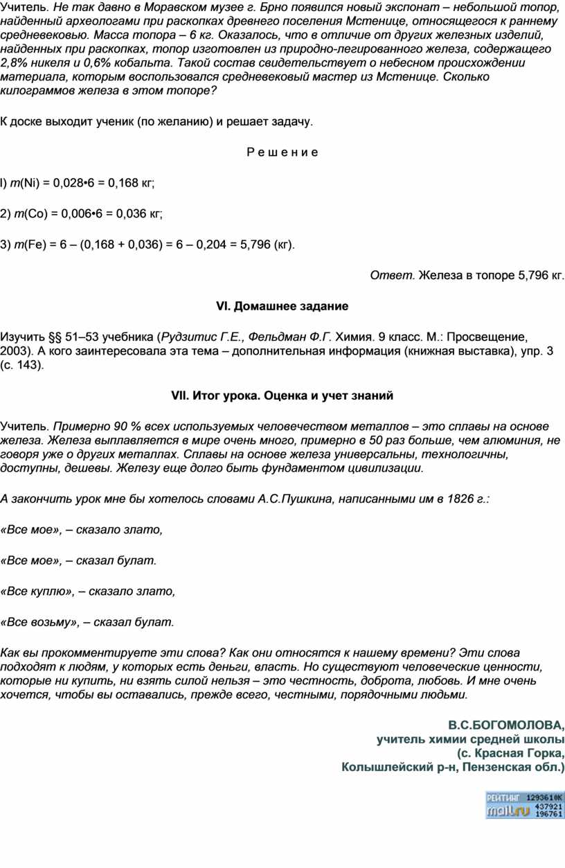 7-й ученик. Первое железо, попавшее еще в глубокой древности в руки человека, было, по-видимому, не земного, а космического происхождения: железо входило в состав метеоритов, упавших на нашу планету. Не случайно на некоторых древних языках железо именуется «небесным камнем» или «металлом, капнувшим с неба». В то же время многие крупные ученые еще в конце XVIII века не допускали и мысли о том, что Вселенная может «снабжать» Землю железом. В 1751 году вблизи немецкого города Ваграма упал метеорит. Спустя сорок лет венский профессор Штюц писал об этом событии: «Можно себе представить, что в 1751 г. даже самые просвещенные люди в Германии могли поверить в падение куска железа с неба – настолько слабы были тогда их познания в естественных науках... Но в наше время непростительно считать возможными подобные сказки».