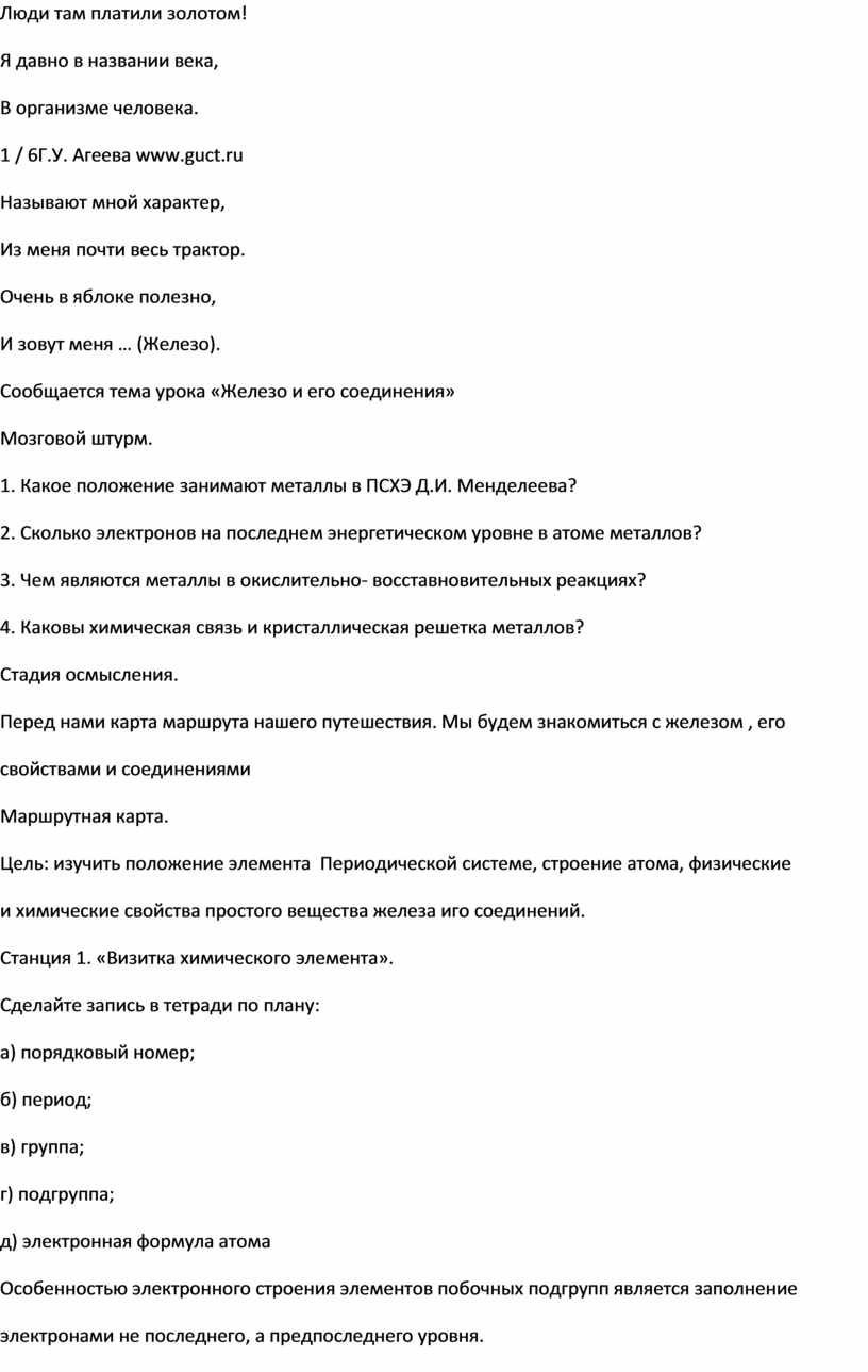 Учитель. Характеристику любого элемента мы начинаем всегда по его положению в периодической таблице. Железо находится в побочной подгруппе VIII группы. Это d-элемент, у которого заполняется электронами предпоследний энергетический уровень: