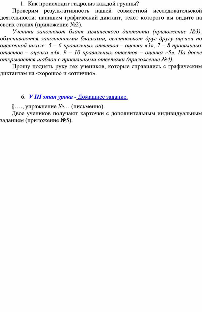 Ученики заполняют бланк химического диктанта (приложение №3), обмениваются заполненными бланками, выставляют друг другу оценки по оценочной шкале: 5 – 6 правильных ответов – оценка «3», 7 – 8 правильных ответов – оценка «4», 9 – 10 правильных ответов – оценка «5». На доске открывается шаблон с правильными ответами (приложение №4).