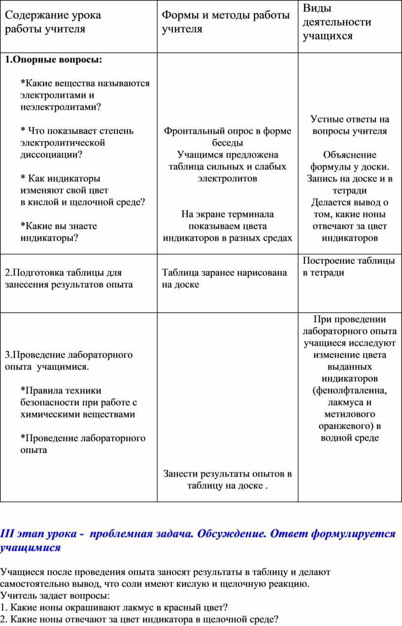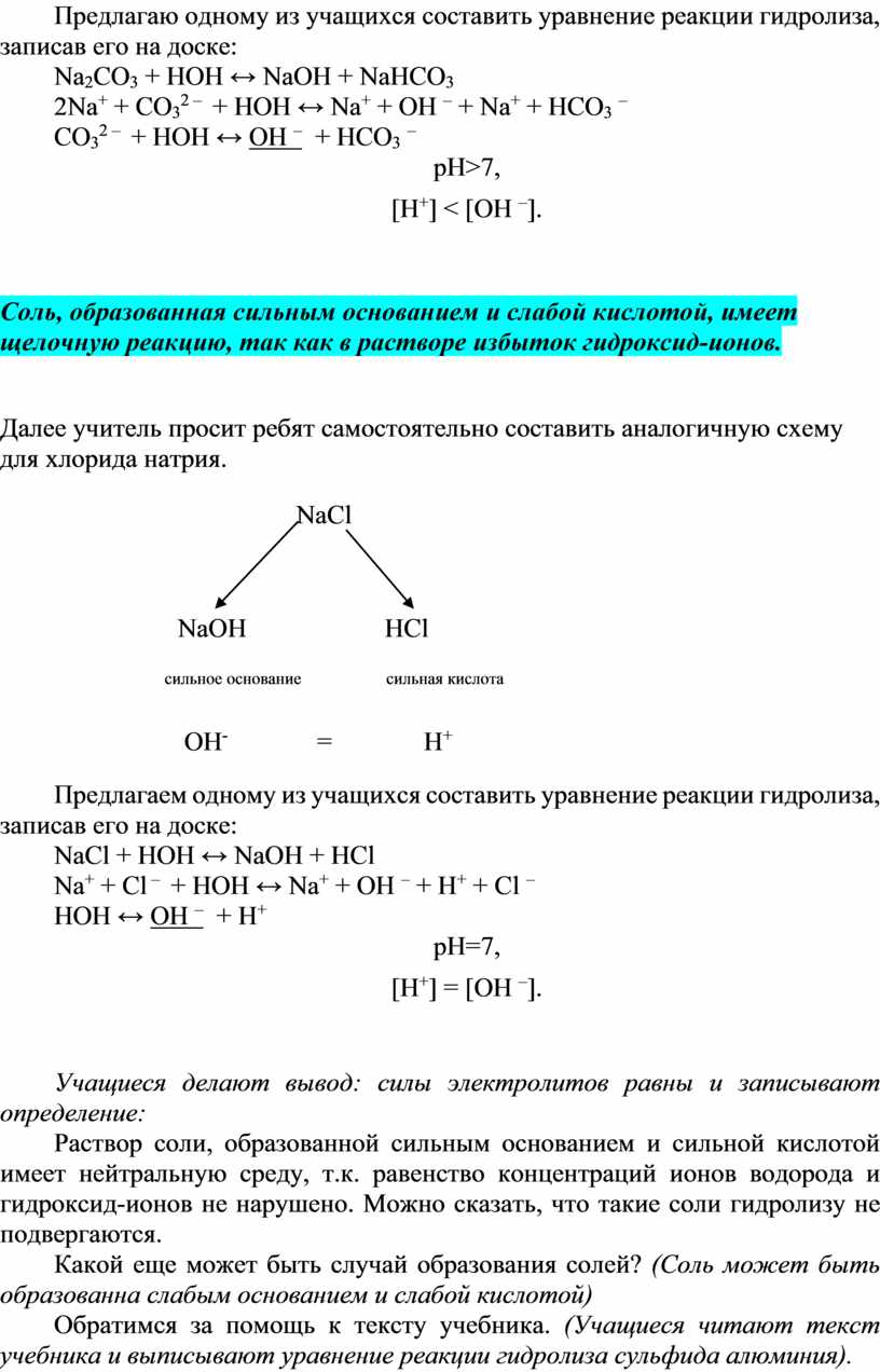 Оборудование: Таблица сильных и слабых электролитов. Компьютерный терминал, дискета с презентациями поэтапного показа схем проведения опыта по гидролизу солей и анализа его результатов