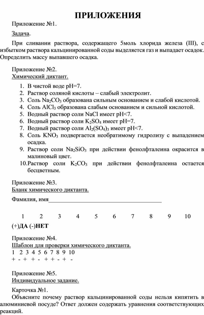 Реактивы: растворы солей: хлорид алюминия, карбонат натрия, хлорид натрия, хлорид железа (3), индикаторы — лакмус, фенолфталеин, метиловый оранжевый.