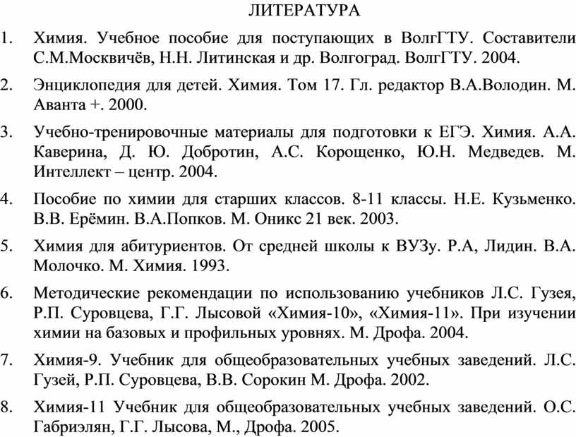 1. Химия. Учебное пособие для поступающих в ВолгГТУ. Составители С.М.Москвичёв, Н.Н. Литинская и др. Волгоград. ВолгГТУ. 2004.