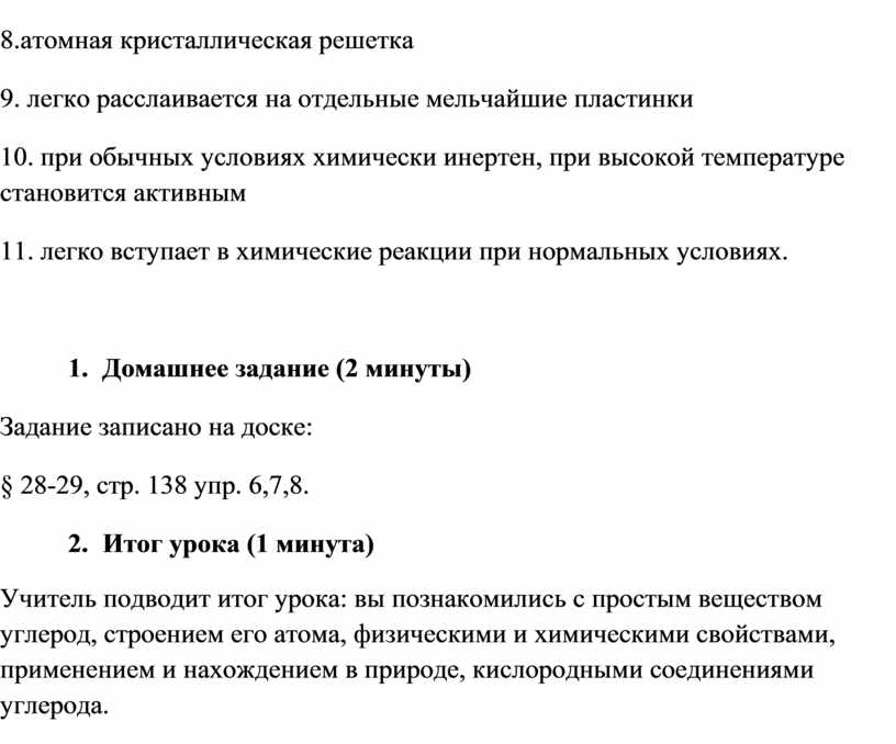 Учитель подводит итог урока: вы познакомились с простым веществом углерод, строением его атома, физическими и химическими свойствами, применением и нахождением в природе, кислородными соединениями углерода.