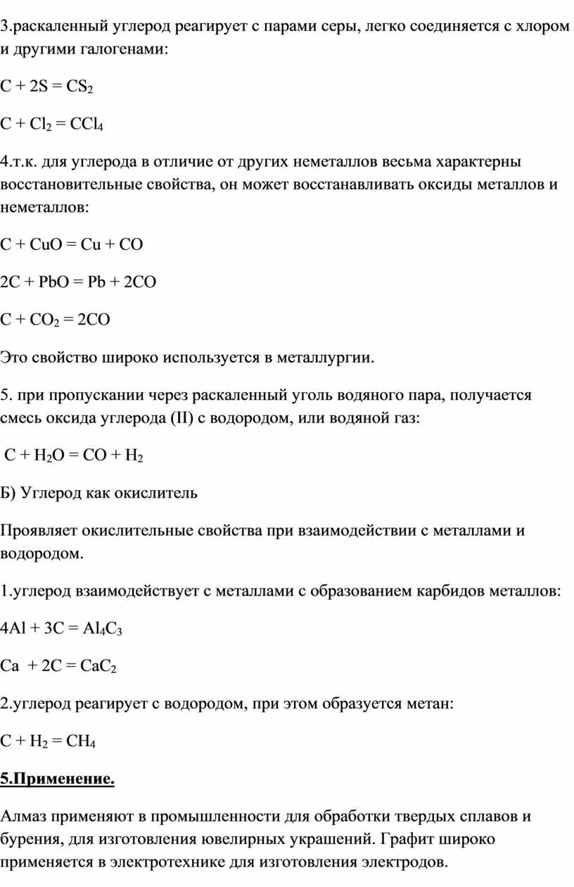 3.раскаленный углерод реагирует с парами серы, легко соединяется с хлором и другими галогенами: