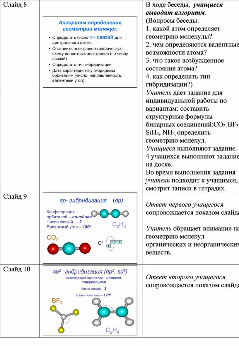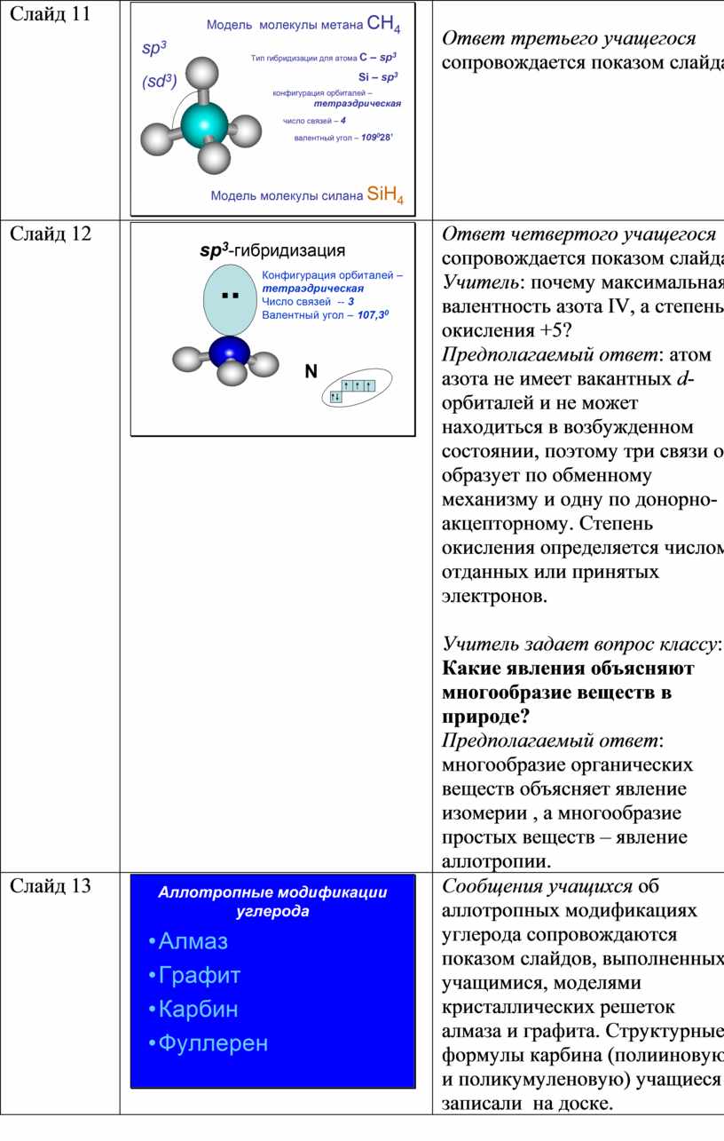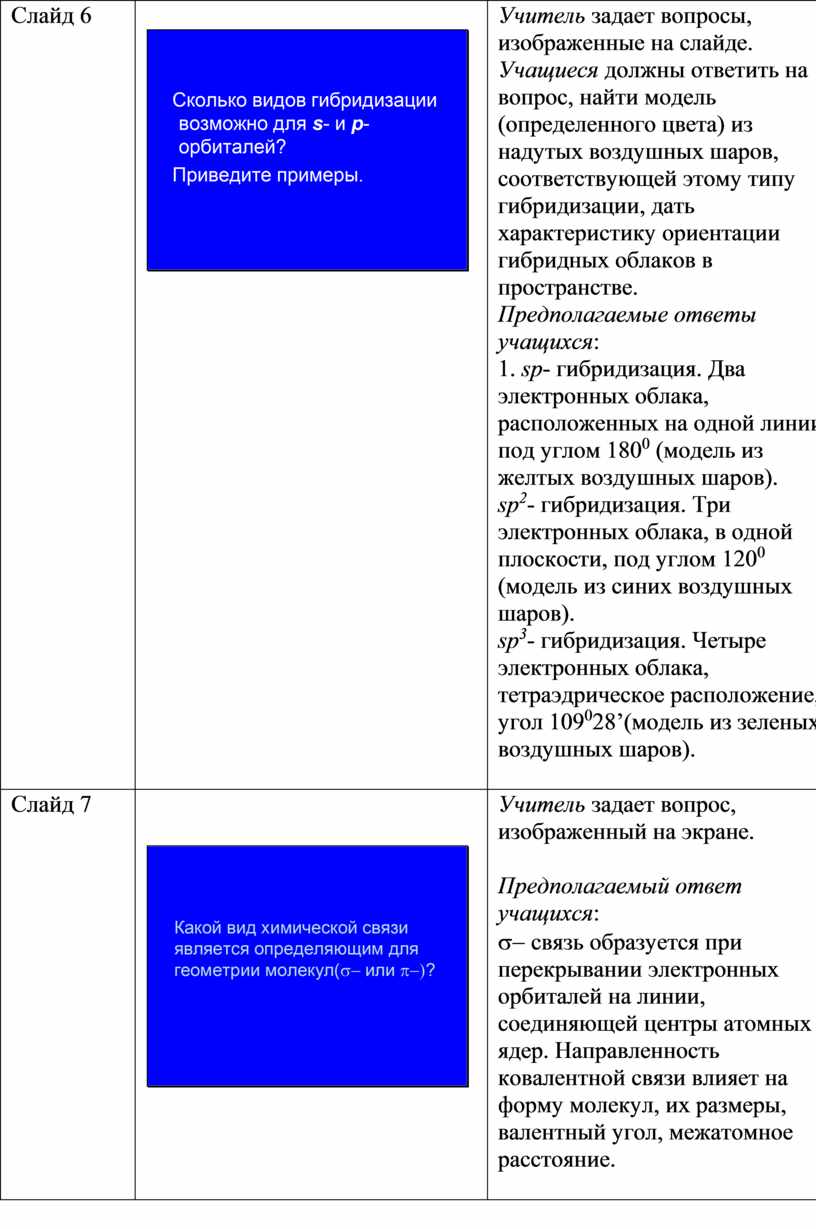 Оборудование: модели кристаллических решеток графита, алмаза; модели из воздушных шаров, связанных по 2, по 3, по 4, соответствующие типам гибридизации sp-, sp2-, sp3-; компьютер, экран, мультимедийный проектор.
