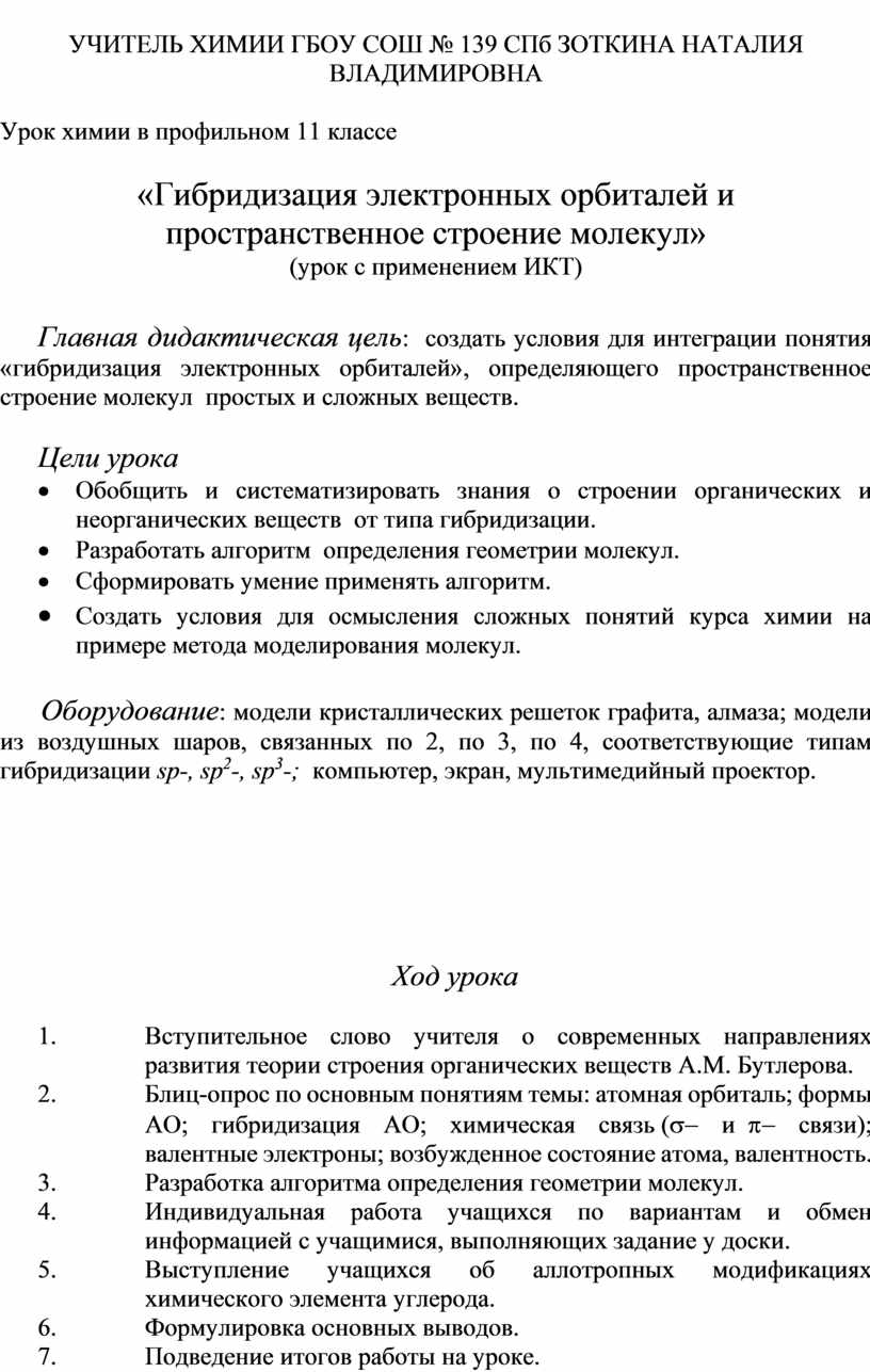 Главная дидактическая цель: создать условия для интеграции понятия «гибридизация электронных орбиталей», определяющего пространственное строение молекул простых и сложных веществ.