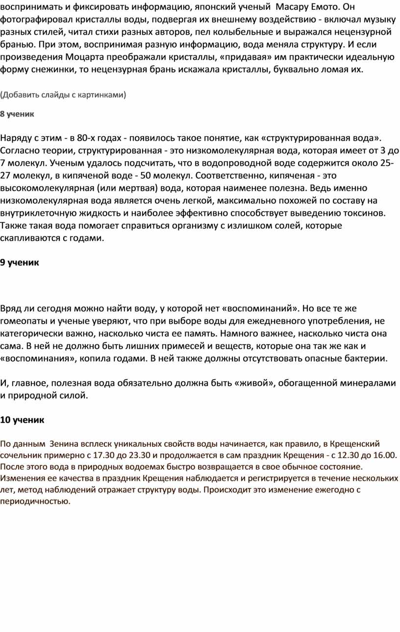 3 ученик Чистая вода представляет собой бесцветную прозрачную жидкость. Плотность воды при переходе ее из твердого состояния в жидкое не уменьшается, как почти у всех других веществ, а возрастает. При нагревании воды от 0 до 4 градусов по Цельсию плотность ее также увеличивается. При 4 градусах вода имеет максимальную плотность, это объясняется свойствами водородных связей ее молекул. А при дальнейшем нагревании ее плотность снова уменьшается. Сплошные загадки, верно?