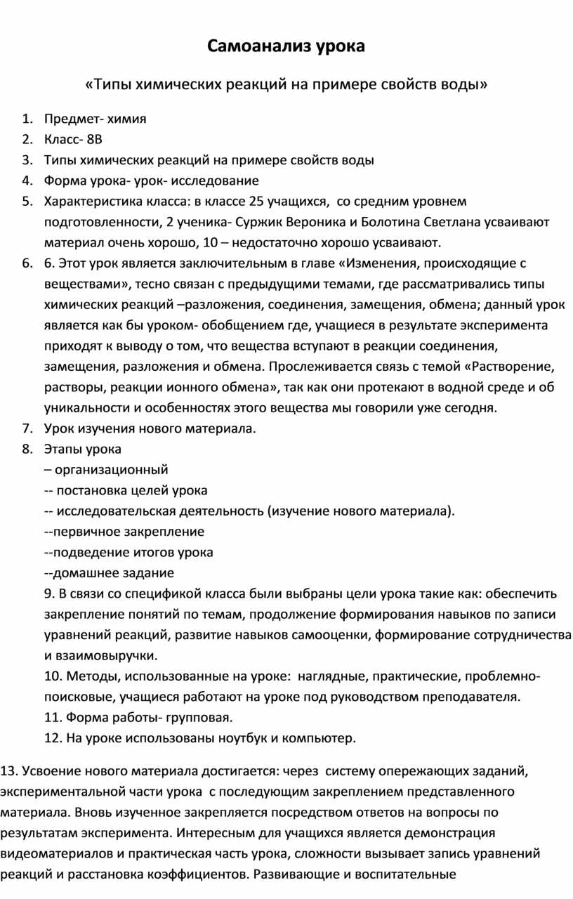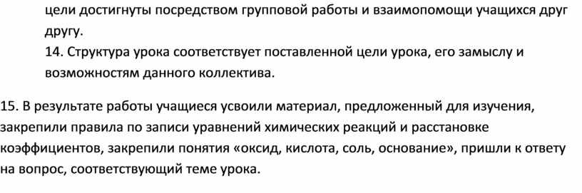 13. Усвоение нового материала достигается: через систему опережающих заданий, экспериментальной части урока с последующим закреплением представленного материала. Вновь изученное закрепляется посредством ответов на вопросы по результатам эксперимента. Интересным для учащихся является демонстрация видеоматериалов и практическая часть урока, сложности вызывает запись уравнений реакций и расстановка коэффициентов. Развивающие и воспитательные цели достигнуты посредством групповой работы и взаимопомощи учащихся друг другу.