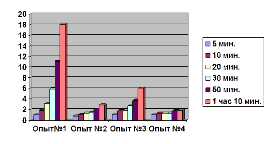 Результат в каждой мерной пробирке записываем отдельно. По полученным данным строим графики скорости коррозионного процесса. На оси абсцисс откладываем время в минутах; на оси ординат – объем водорода в миллилитрах.