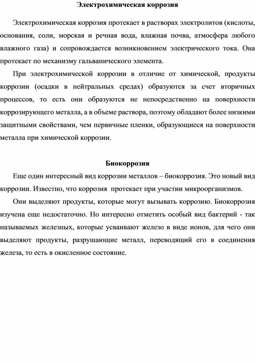 Они выделяют продукты, которые могут вызывать коррозию. Биокоррозия изучена еще недостаточно. Но интересно отметить особый вид бактерий - так называемых железных, которые усваивают железо в виде ионов, для чего они выделяют продукты, разрушающие металл, переводящий его в соединения железа, то есть в окисленное состояние.