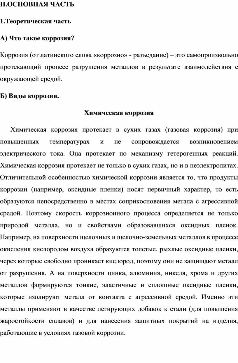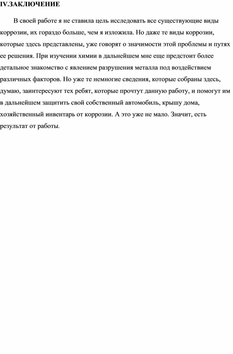 В своей работе я не ставила цель исследовать все существующие виды коррозии, их гораздо больше, чем я изложила. Но даже те виды коррозии, которые здесь представлены, уже говорят о значимости этой проблемы и путях ее решения. При изучении химии в дальнейшем мне еще предстоит более детальное знакомство с явлением разрушения металла под воздействием различных факторов. Но уже те немногие сведения, которые собраны здесь, думаю, заинтересуют тех ребят, которые прочтут данную работу, и помогут им в дальнейшем защитить свой собственный автомобиль, крышу дома, хозяйственный инвентарь от коррозии. А это уже не мало. Значит, есть результат от работы.
