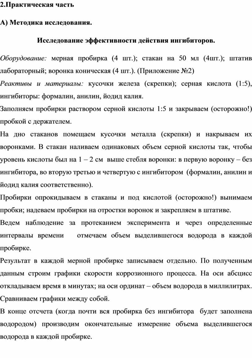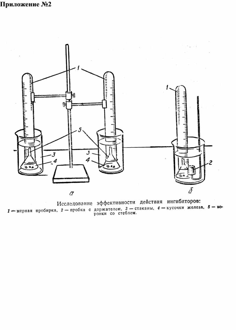 Реактивы и материалы: кусочки железа (скрепки); серная кислота (1:5), ингибиторы: формалин, анилин, йодид калия.