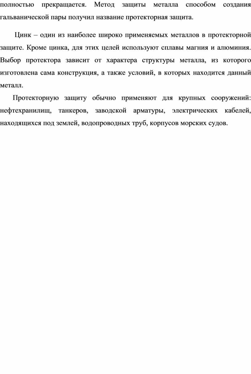 Рассматривая процесс ржавления металлов, я отметила, что если железо находится в контакте с другими металлами, то последние могут сильно изменить скорость ржавления. В одних случаях – контакта железа с медью (контакт с менее активным металлом) – скорость ржавления увеличивается, а в других, когда железо находится в контакте с алюминием, цинком (контакт железа с более активным металлом), наоборот, ржавление замедляется или полностью прекращается. Метод защиты металла способом создания гальванической пары получил название протекторная защита.
