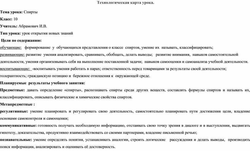 Предметные: давать определение «спирты», распознавать спирты среди других веществ, составлять формулы спиртов и называть их, классифицировать, описывать физические и химические свойства спиртов.