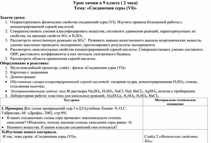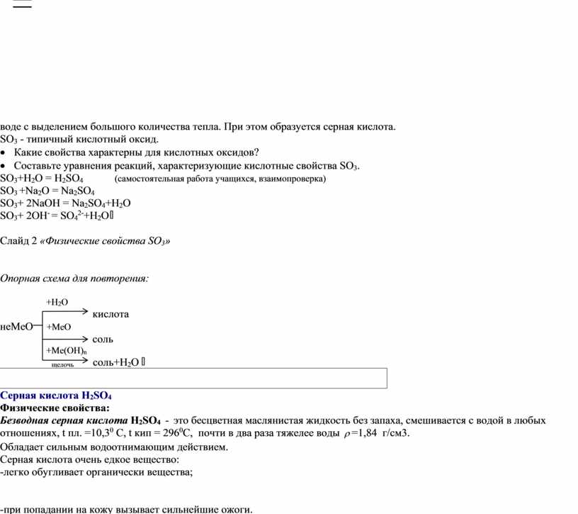 1. Охарактеризовать физические свойства соединений серы (VI). Изучить правила безопасной работы с концентрированной серной кислотой.