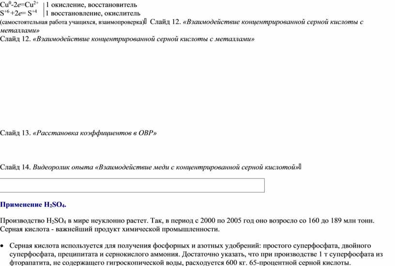 Слайд 14. Видеоролик опыта «Взаимодействие меди с концентрированной серной кислотой» |