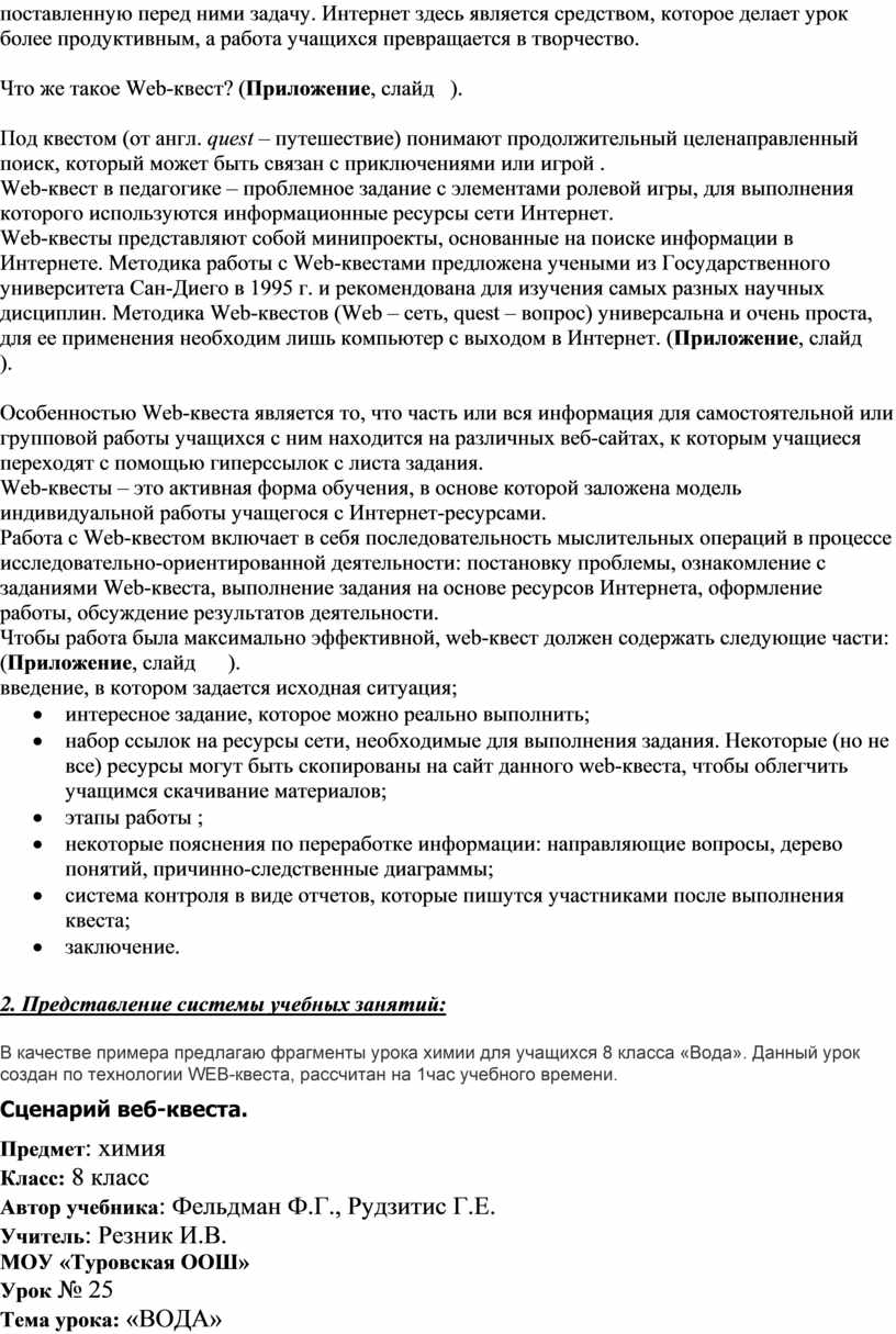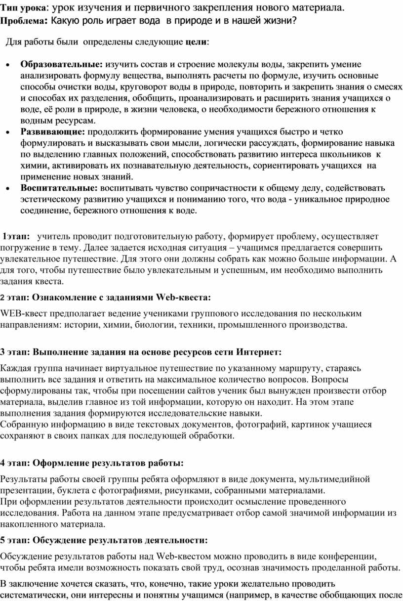 В качестве примера предлагаю фрагменты урока химии для учащихся 8 класса «Вода». Данный урок создан по технологии WEB-квеста, рассчитан на 1час учебного времени.