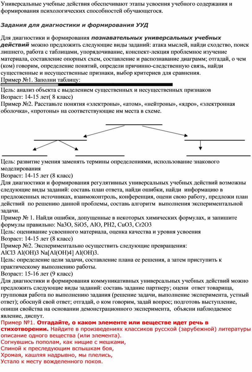 Для диагностики и формирования познавательных универсальных учебных действий можно предложить следующие виды заданий: атака мыслей, найди сходство, поиск лишнего, работа с таблицами, упорядочивание, конспект-лекция проблемное изучение материала, составление опорных схем, составление и распознавание диаграмм; отгадай, о чем (ком) говорим, определение понятий, определи причинно-следственную связь, найди существенные и несущественные признаки, выбор критериев для сравнения.