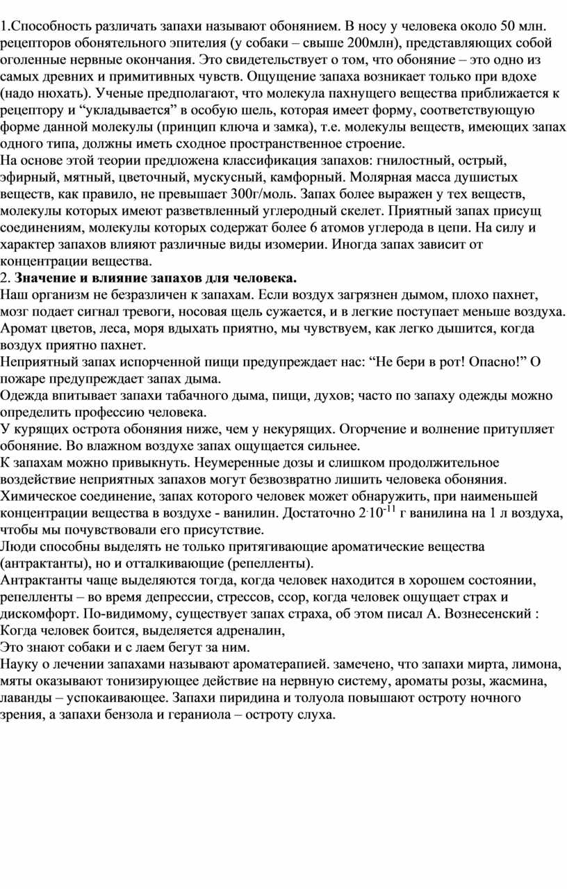 На основе этой теории предложена классификация запахов: гнилостный, острый, эфирный, мятный, цветочный, мускусный, камфорный. Молярная масса душистых веществ, как правило, не превышает 300г/моль. Запах более выражен у тех веществ, молекулы которых имеют разветвленный углеродный скелет. Приятный запах присущ соединениям, молекулы которых содержат более 6 атомов углерода в цепи. На силу и характер запахов влияют различные виды изомерии. Иногда запах зависит от концентрации вещества.