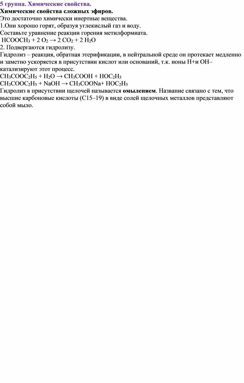 Основным химическим свойством сложных эфиров является их гидролиз. Гидролиз может катализироваться кислотой или основанием.