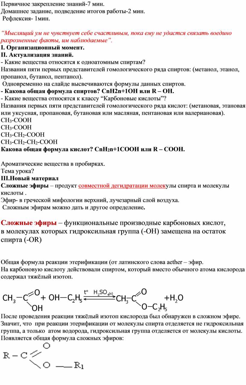 Объяснять механизм этерификации. Различать группы сложных эфиров, уметь давать названия сложным эфирам. Прогнозировать по строению веществ принадлежности к классу химических соединений.