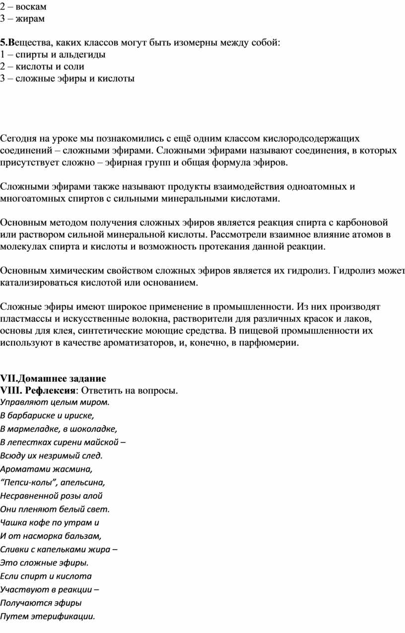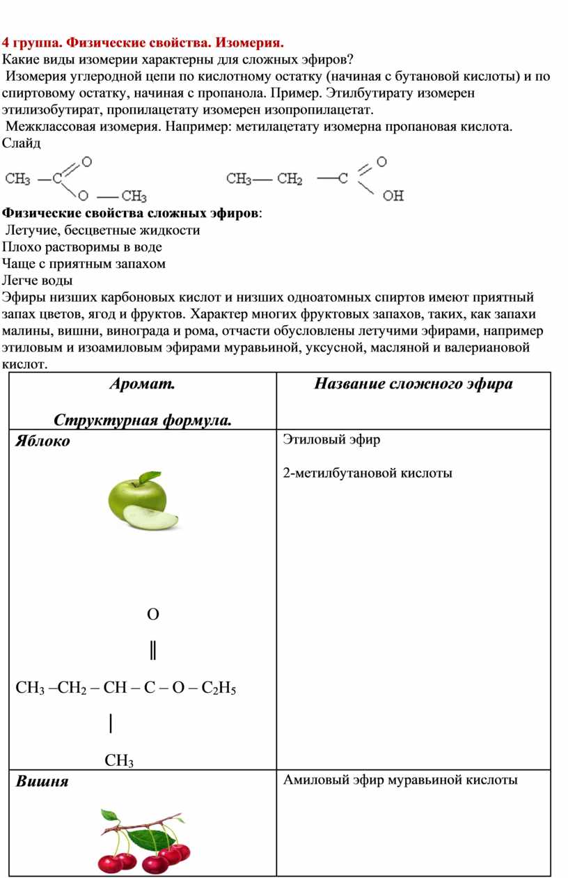 - классифицировать сложные эфиры, разбираться в механизме реакций этерификации и гидролиза эфиров, знать практическое значение эфиров