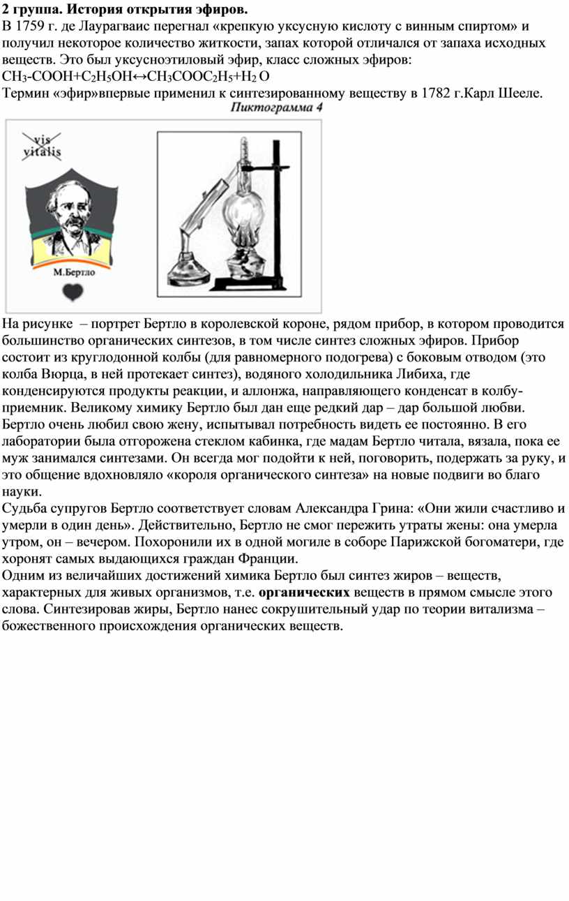 5.Реактивы:(этиловый спирт, уксусная, концентрированная серная кислота, штативы для пробирок, пробирки с пробками, спиртовки, пробиркодержатели).