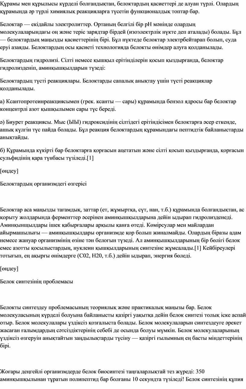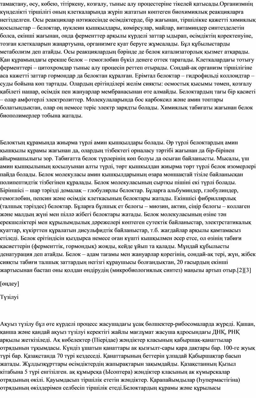 Ақуыз түзілу бұл өте күрделі процесс жасушадағы ұсақ бөлшектер-рибосомаларда жүреді. Қашан, қанша және қандай ақуыз түзілуі керектігі жайлы мағлұмат жасуша ядросындағы ДНҚ, РНҚ арқылы жеткізіледі. Ақ көбелектер (Піерідае) жәндіктер класының қабыршақ-қанаттылар отрядынын тұқымдасы. Күндіз ұшатын қанаттары ак қызғылт-сары қара дақтары бар. 100-ге жуық түрі бар. Қазақстанда 70 түрі кездеседі. Қанаттарының беттерін ұлпадай Қабыршақтар басып жатады. Жұлдызқұрттары өсімдіктердің жапырақтарын зақымдайды. Қазақстанның Қызыл кітабына 5 түрі енгізілген. ақ құмырсқа (Ысоптера) жәндіктер класының ак күмырскалар отрядының өкілі. Қауымдасып тіршілік ететін жәндіктер. Қарапайымдылар (Һyпермастігіна) отрядының өкілдерімен селбесіп тіршілік етеді.Белоктардың құрамы және құрылысы
