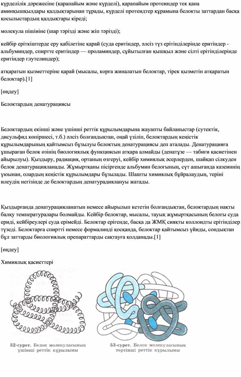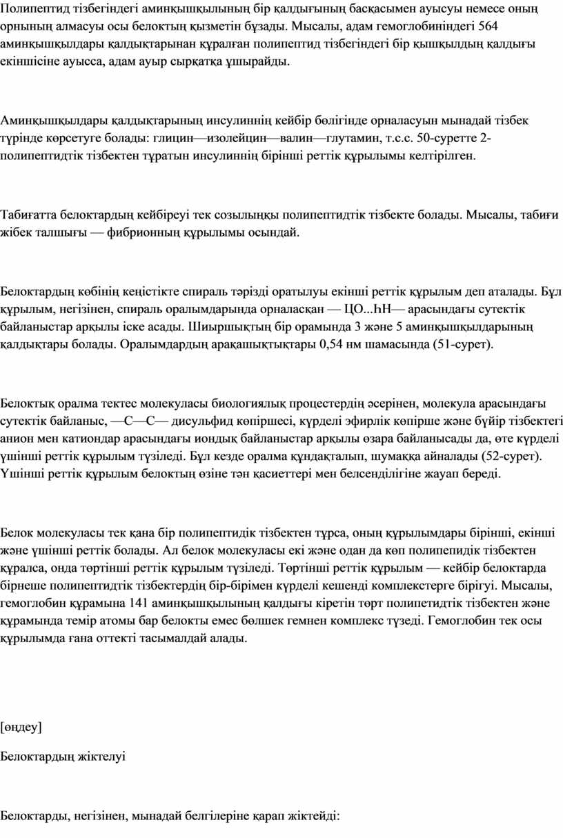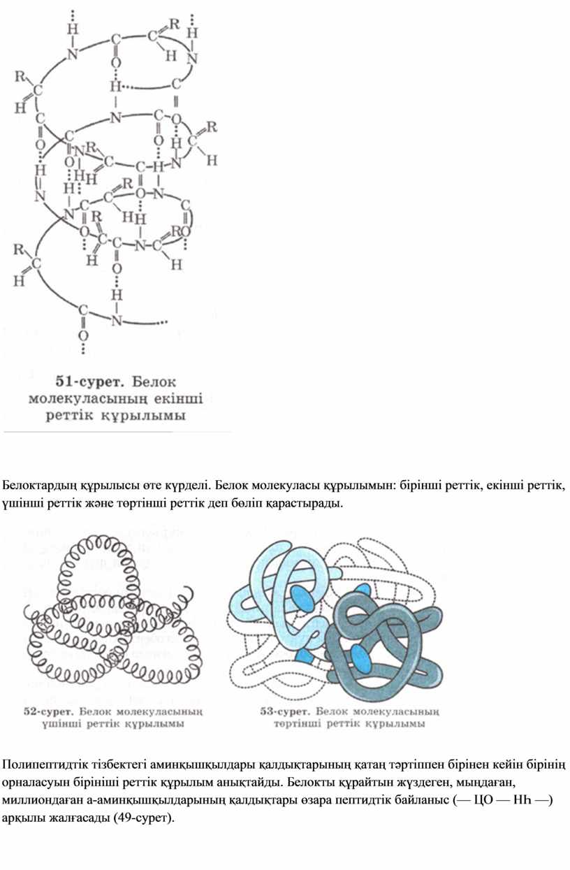 Белоктардың көбінің кеңістікте спираль тәрізді оратылуы екінші реттік құрылым деп аталады. Бұл құрылым, негізінен, спираль оралымдарында орналасқан — ЦО...ҺН— арасындағы сутектік байланыстар арқылы іске асады. Шиыршықтың бір орамында 3 және 5 аминқышқылдарының қалдықтары болады. Оралымдардың арақашықтықтары 0,54 нм шамасында (51-сурет).