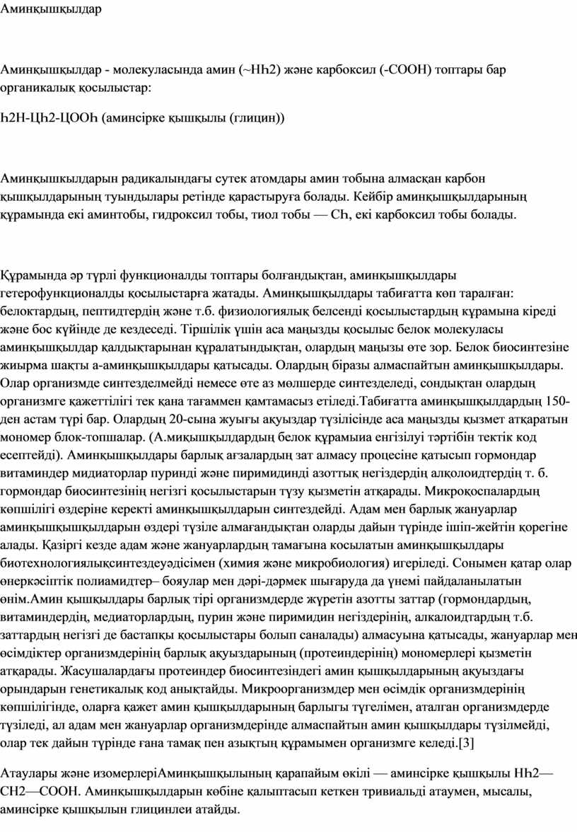 Аминқышқылдар - молекуласында амин (~НҺ2) және карбоксил (-СООН) топтары бар органикалық қосылыстар: