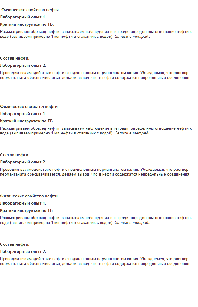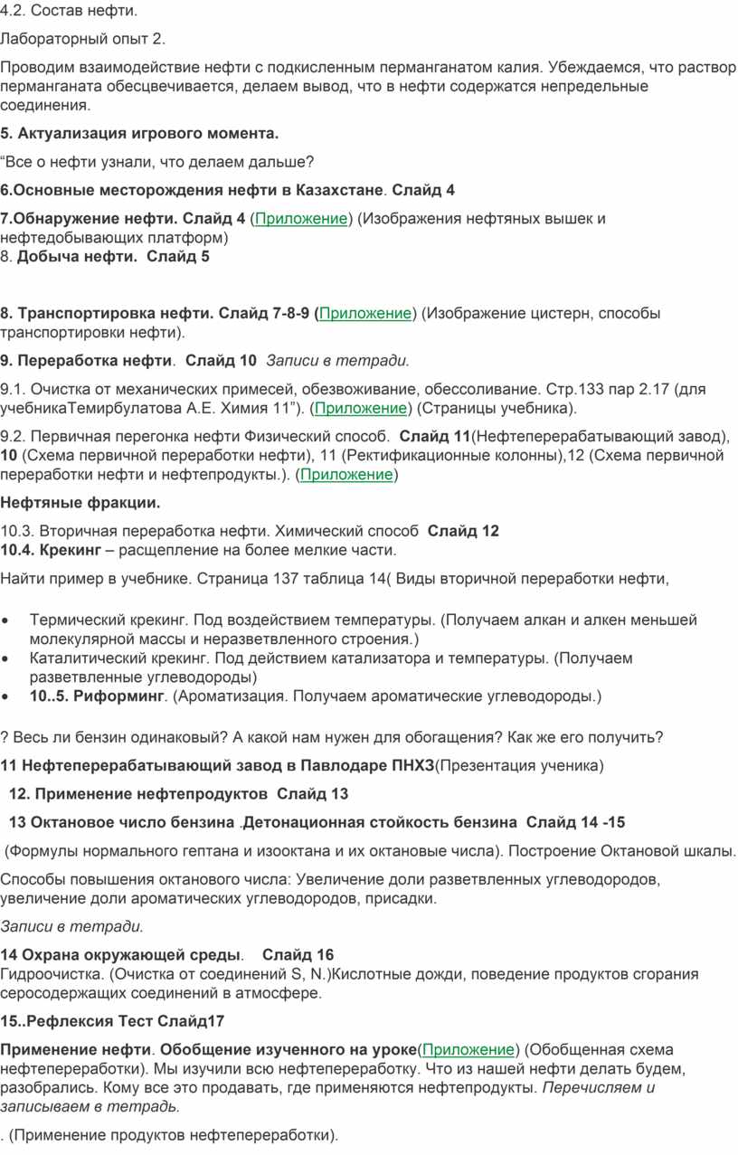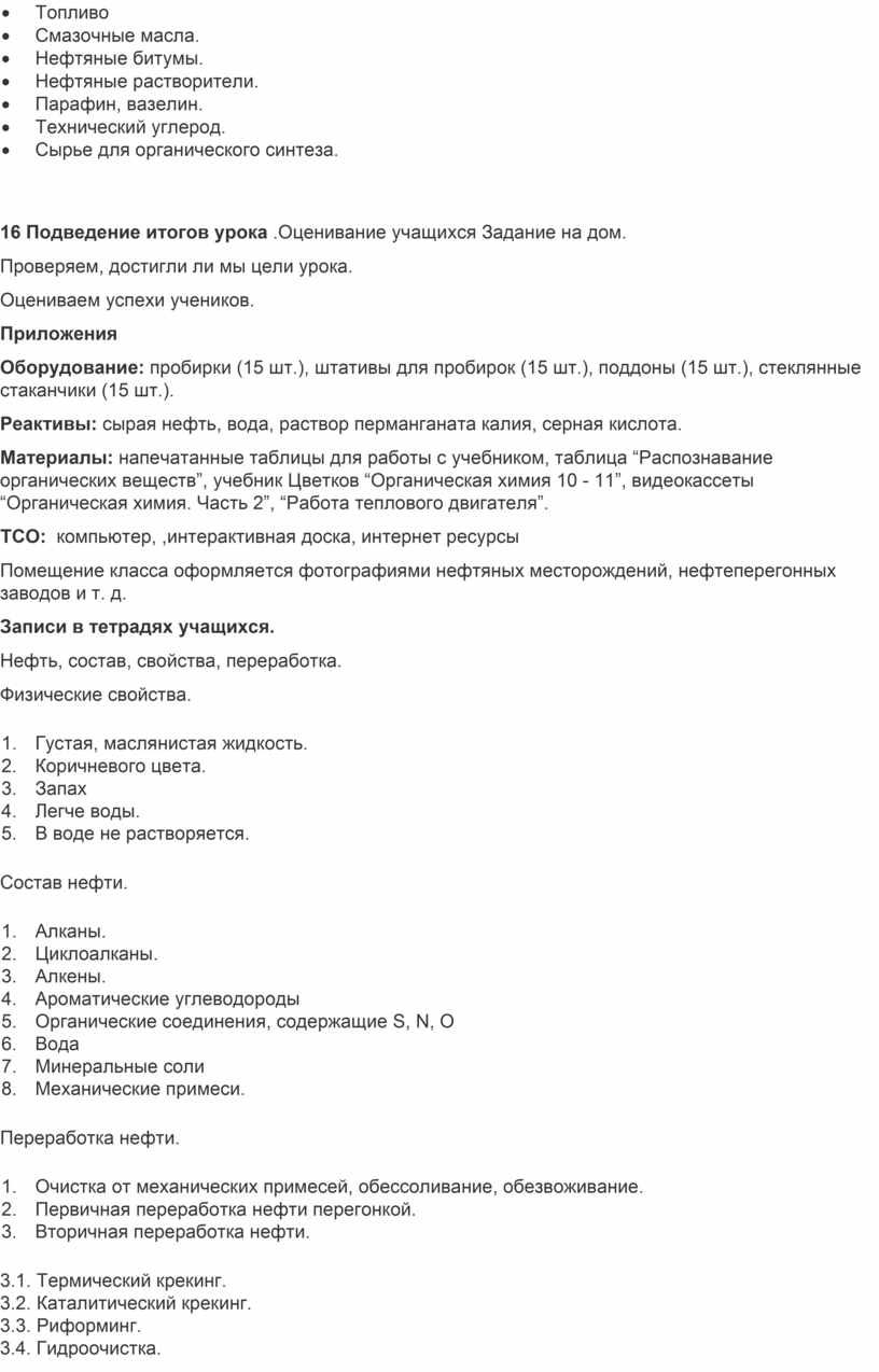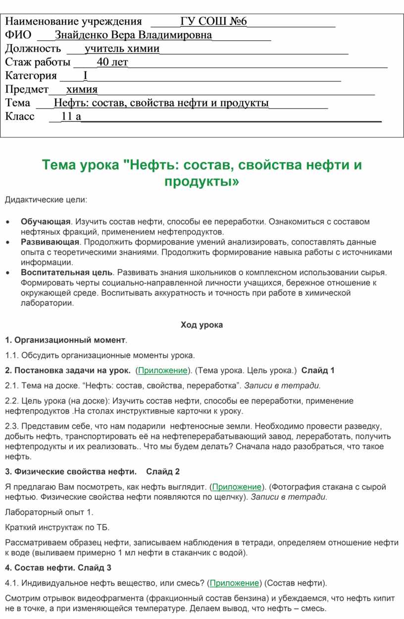 2.2. Цель урока (на доске): Изучить состав нефти, способы ее переработки, применение нефтепродуктов .На столах инструктивные карточки к уроку.