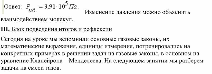 Сегодня на уроке мы вспомнили основные газовые законы, их математические выражения, единицы измерения, потренировались на конкретных примерах в решении задач на газовые законы, в основном на уравнение Клапейрона – Менделеева. На следующем занятии мы разберем задачи на смеси газов.