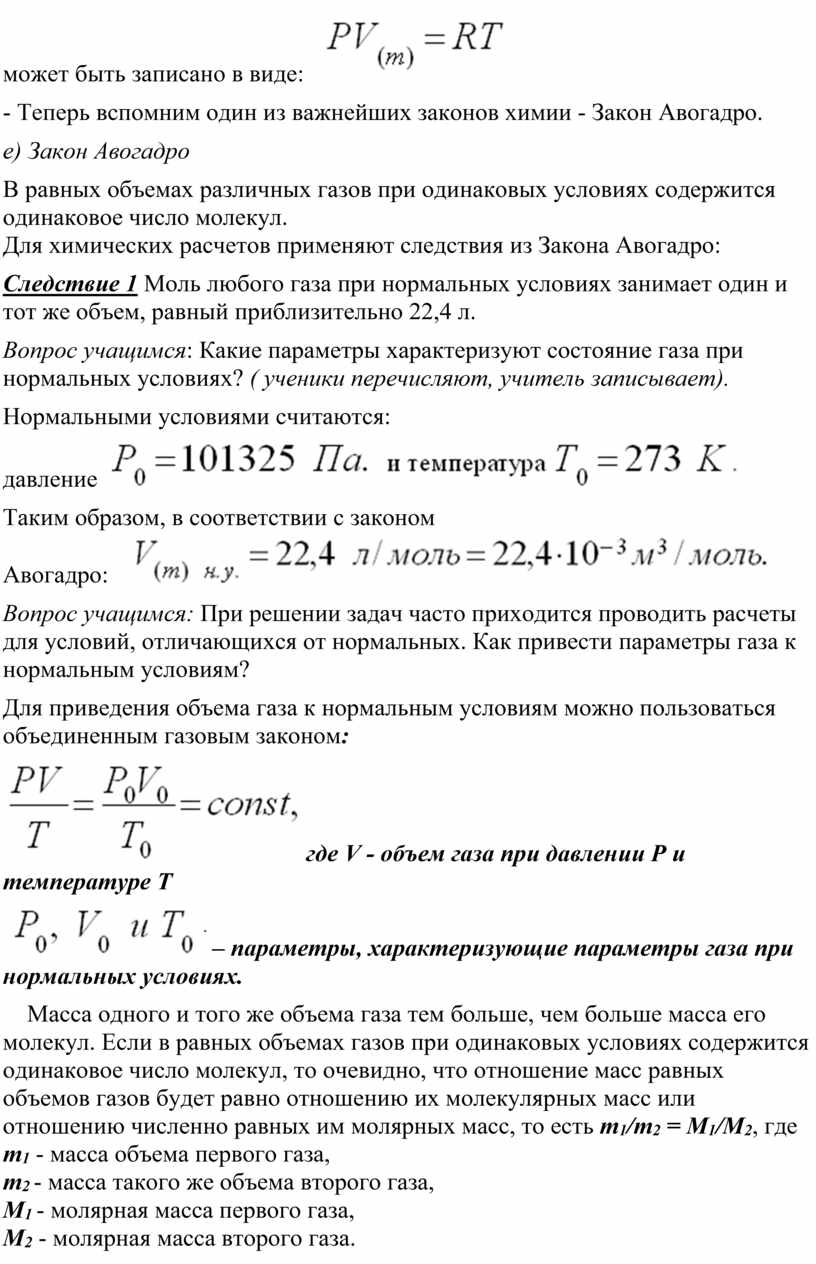 Вопрос учащимся: При решении задач часто приходится проводить расчеты для условий, отличающихся от нормальных. Как привести параметры газа к нормальным условиям?