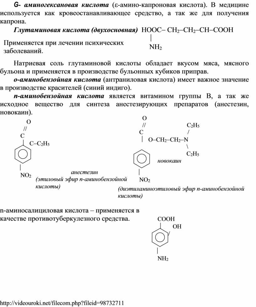 G- аминогексановая кислота (e-амино-капроновая кислота). В медицине используется как кровеостанавливающее средство, а так же для получения капрона.