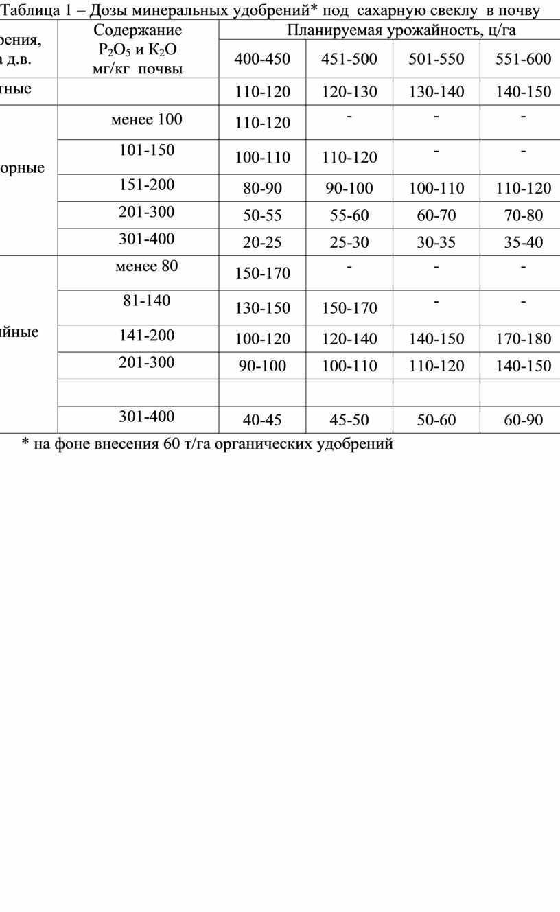 Таблица 1 – Дозы минеральных удобрений* под сахарную свеклу в почву