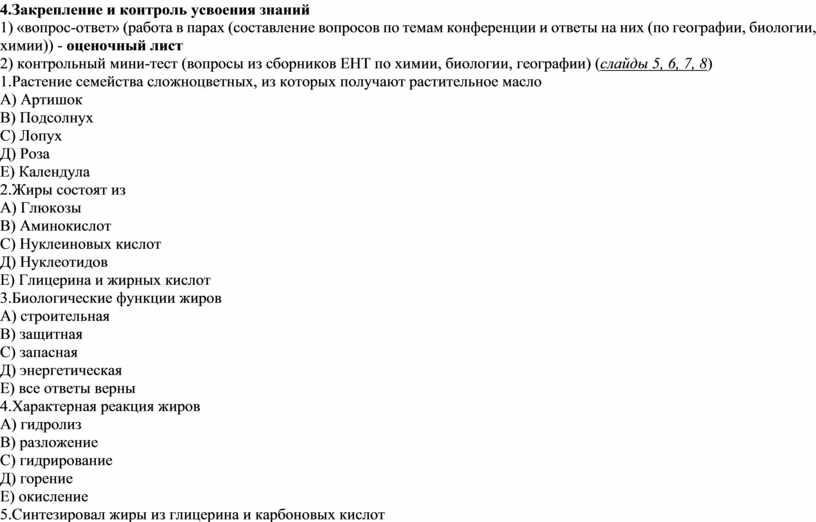 2) контрольный мини-тест (вопросы из сборников ЕНТ по химии, биологии, географии) (слайды 5, 6, 7, 8)