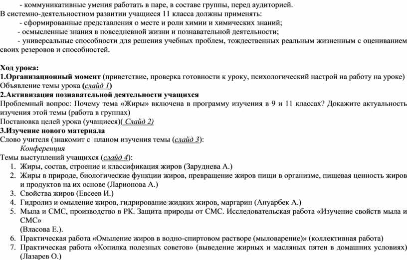 Цели урока: 1. Способствовать углублению знаний учащихся о жирах, их составе и строении, свойствах, превращении жиров в организме, их роли в питании. Расширить знания учащихся о способах переработки жиров, биологической роли жиров и значении этих процессов. Рассмотреть проблему замены пищевого сырья непищевым. Показать различие в свойствах мыла и СМС.